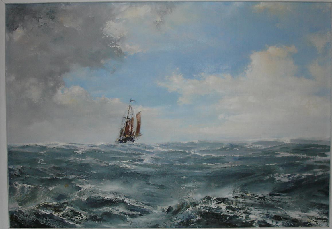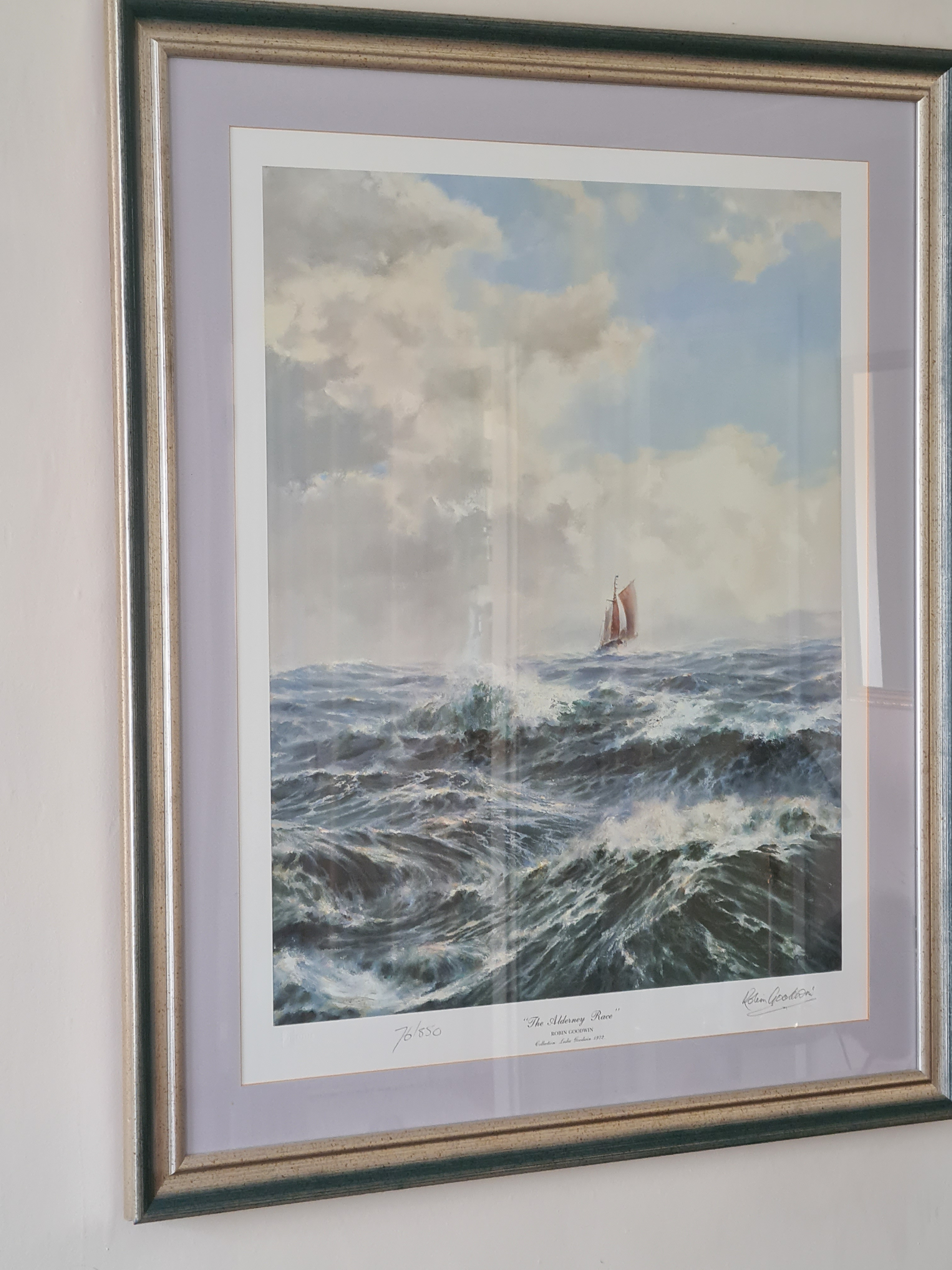 The Limited edition is called "The Alderney Race" painted in 1972. The subject was very close to Robins Heart, it was his very own 36 foot Hillyard ketch "The Dudley" battling against wind and rip-tide off the fearsome French coast. The Dudley was home to the Goodwin family, shortly after the war and supplied a lot of subject matter for a number of Seascapes, some of which are pictured on the website. The Limited edition of 850 copies signed by Robin in November 1990. Embossed by the Fine Art Trade Guild.